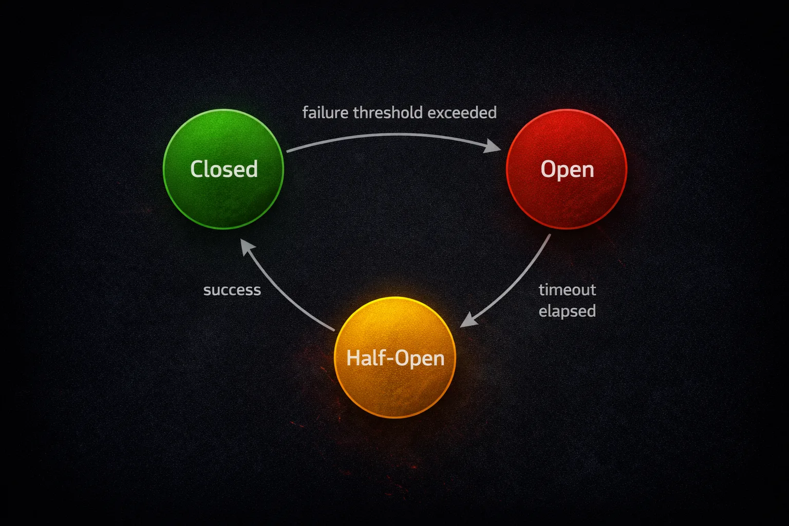 Bir servis çöktüğünde retry yapmak sorunu çözmez, aksine yükü artırır. Circuit Breaker bu döngüyü keser: belirli bir hata eşiği aşılınca bağlantıyı tamamen kapatır, sisteme nefes aldırır ve kendiliğinden iyileşmesine izin verir.