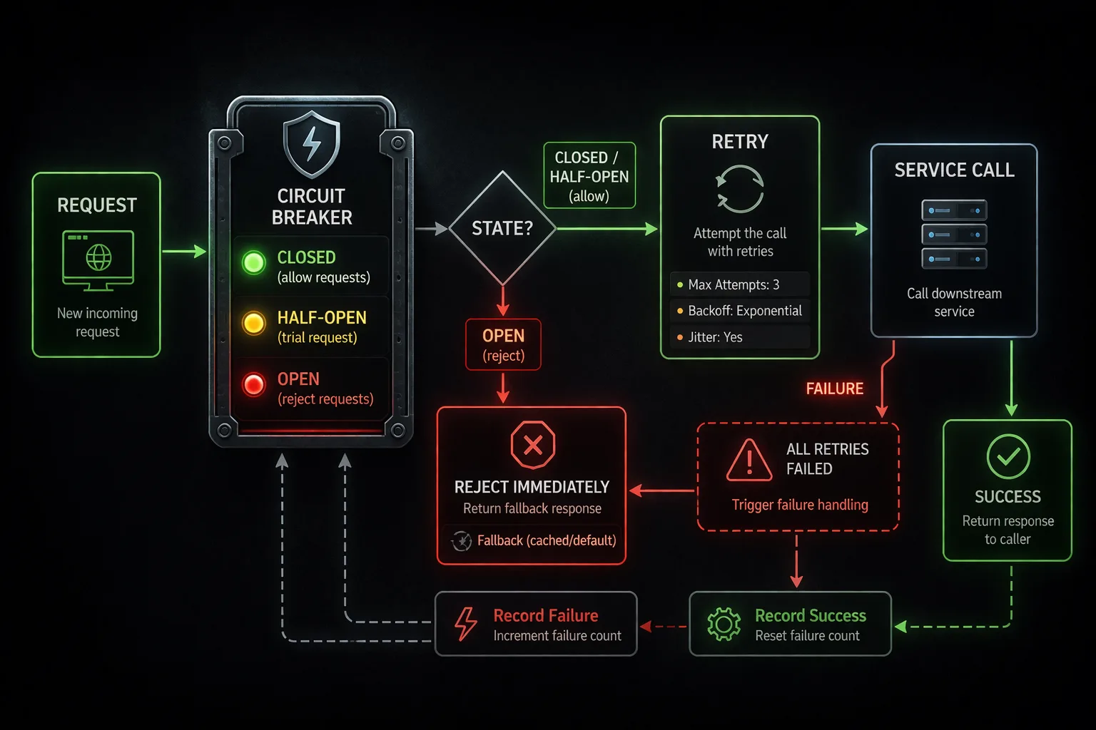 Servis geçici takılıyorsa retry halleder. Tamamen çöktüyse circuit breaker devreye girer ve retry bile denenmez.